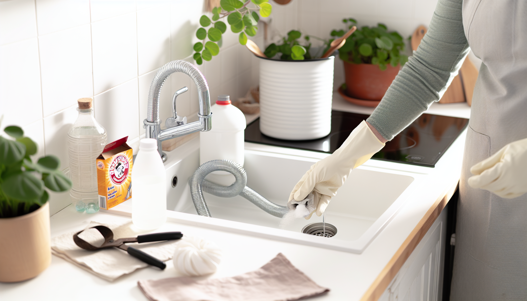 Pour un débouchage naturel et efficace de votre évier, commencez par nettoyer le siphon, puis versez environ 100 g de bicarbonate de soude dans la bonde. Ajoutez environ 100 ml de vinaigre blanc. Bouchez l’évier et laissez reposer entre 30 minutes et 1 heure. Au bout de ce temps, rincez à l’eau chaude. Protégez vos mains par des gants.